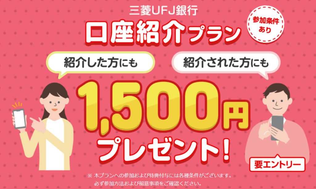 - キャンペーン内容: すでに三菱UFJ銀行の口座を持っている方から紹介コードを受け取り、口座開設後に専用フォームからエントリーすると、紹介者と口座開設者の両方に現金1,500円がプレゼントされます。